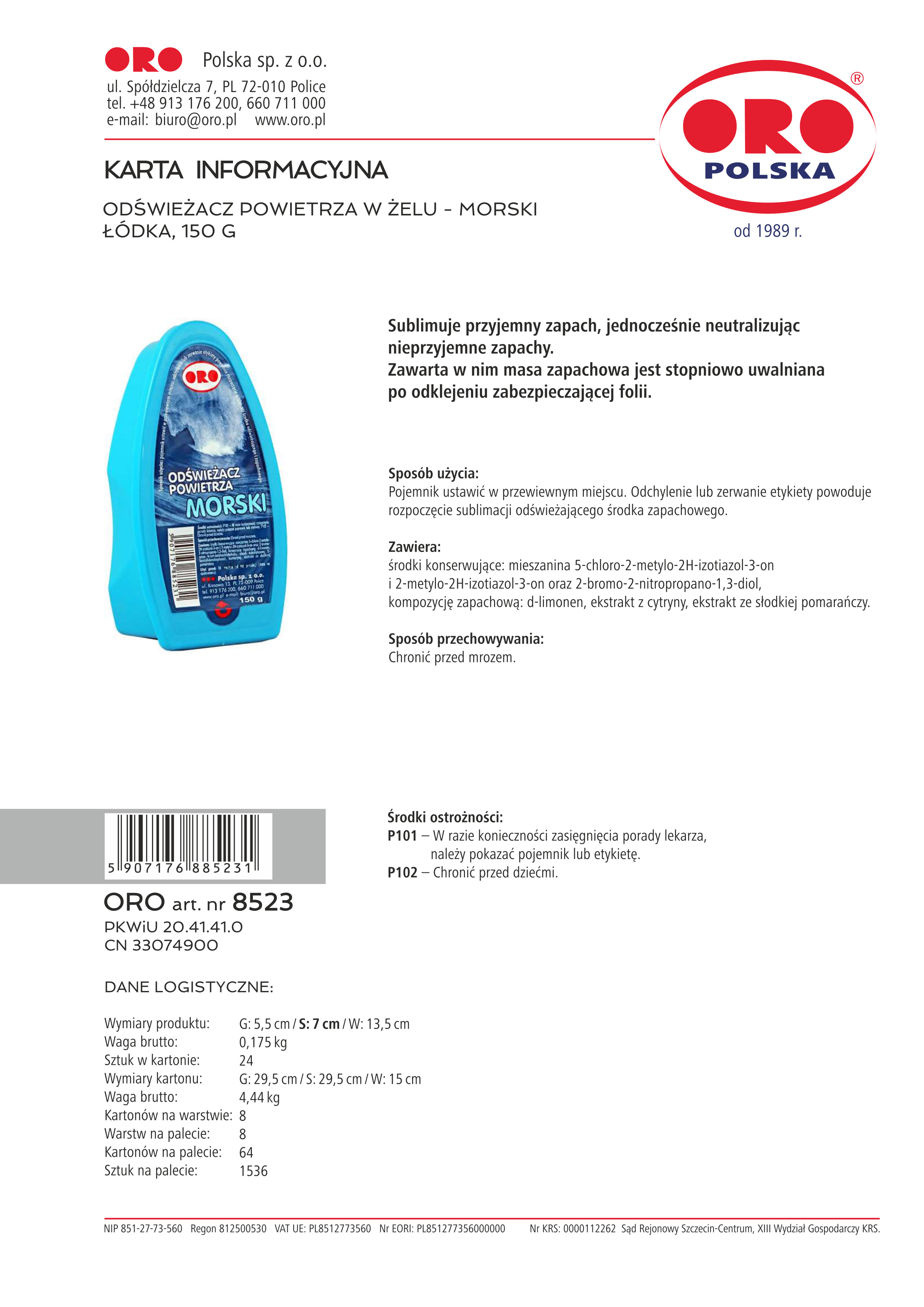 Skutecznie odświeża powietrze i usuwa nieprzyjemne zapachy. Pozostawia odświeżający morski zapach.